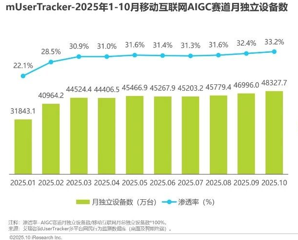 就像报告显示,2025年1-10月,中国移动互联网AIGC赛道进入规模化应用期,用户规模达4.83亿,市场渗透率突破30%,标志着AIGC已从“尝鲜工具”转变为大众级应用。在语言模型领域,豆包APP流量领先,月独立设备数达13253.5万台;腾讯元宝增速尤为突出,近9个月复合增长率达385.1%,凭借微信生态的天然流量池及腾讯系产品协同优势,快速跻身头部阵营。