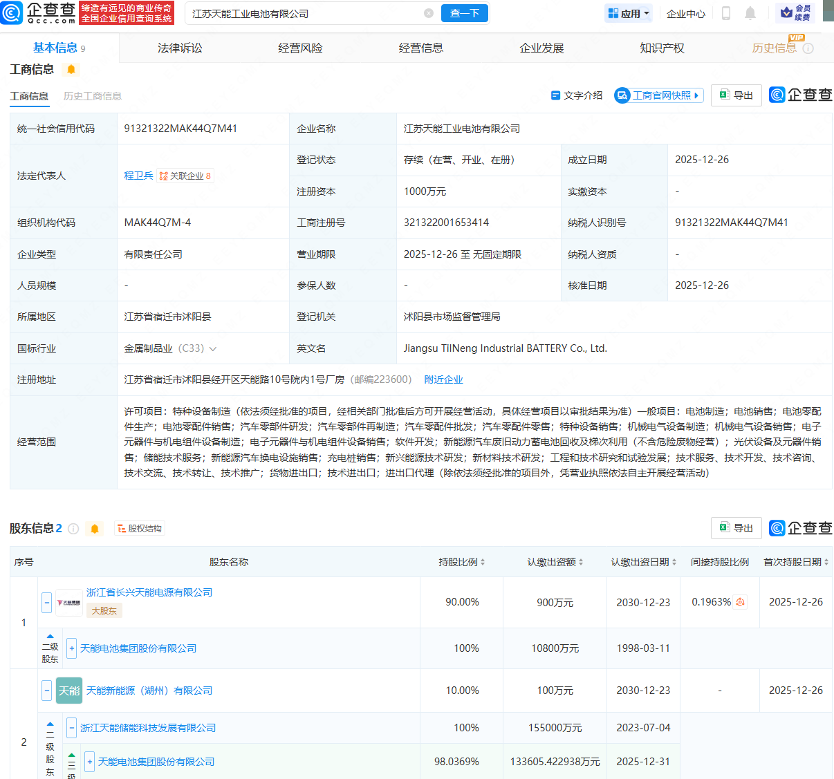 近日,江苏天能工业电池有限公司成立,法定代表人为程卫兵,注册资本为1000万元,经营范围包含:电池制造;电池销售;电池零配件生产;电池零配件销售;汽车零部件研发;汽车零部件再制造等。企查查股权穿透显示,该公司由天能股份(688819)旗下浙江省长兴天能电源有限公司、天能新能源(湖州)有限公司共同持股。