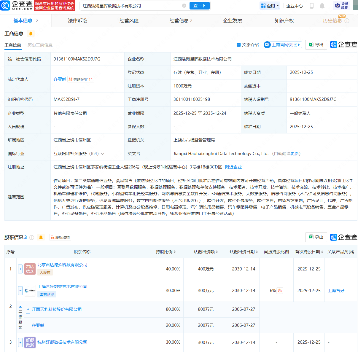 近日,江西浩海星晖数据技术有限公司成立,法定代表人为齐亚魁,注册资本为1000万元,经营范围包含:互联网数据服务,数据处理服务,网络与信息安全软件开发,5G通信技术服务,大数据服务等。企查查股权穿透显示,该公司由北京君达德众科技有限公司、天利科技(300399)旗下上海誉好数据技术有限公司等共同持股。